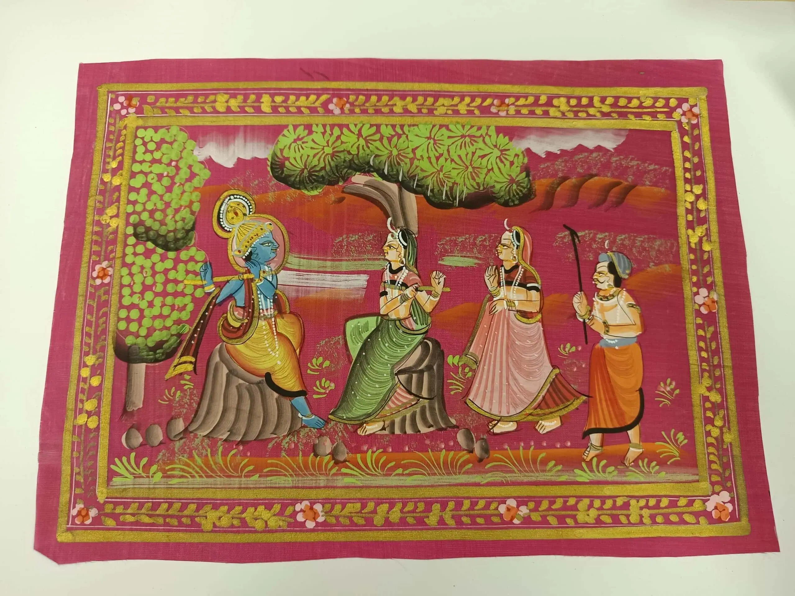 Celebrate the divine love of Lord Krishna through this masterfully hand-painted Pichwai artwork. Depicting Krishna enchanting Radha and the gopis with his melodious flute, this piece captures a timeless moment of spiritual serenity. Inspired by the sacred art traditions of Nathdwara, every detail—from the expressive figures to the lush surroundings—is rendered in vibrant hues and intricate strokes. A harmonious blend of devotion, storytelling, and cultural richness, this painting brings a soulful elegance to any space it adorns.