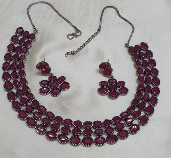This is a Designer German Silver Jewellery Set by Glamvila. The set consists of a necklace and a pair of earrings. Both necklace and earrings are studded with pink stones. It can be worn with traditional and Indo-Western outfits. The colour of product may slightly vary due to photographic lighting or your monitor settings.
