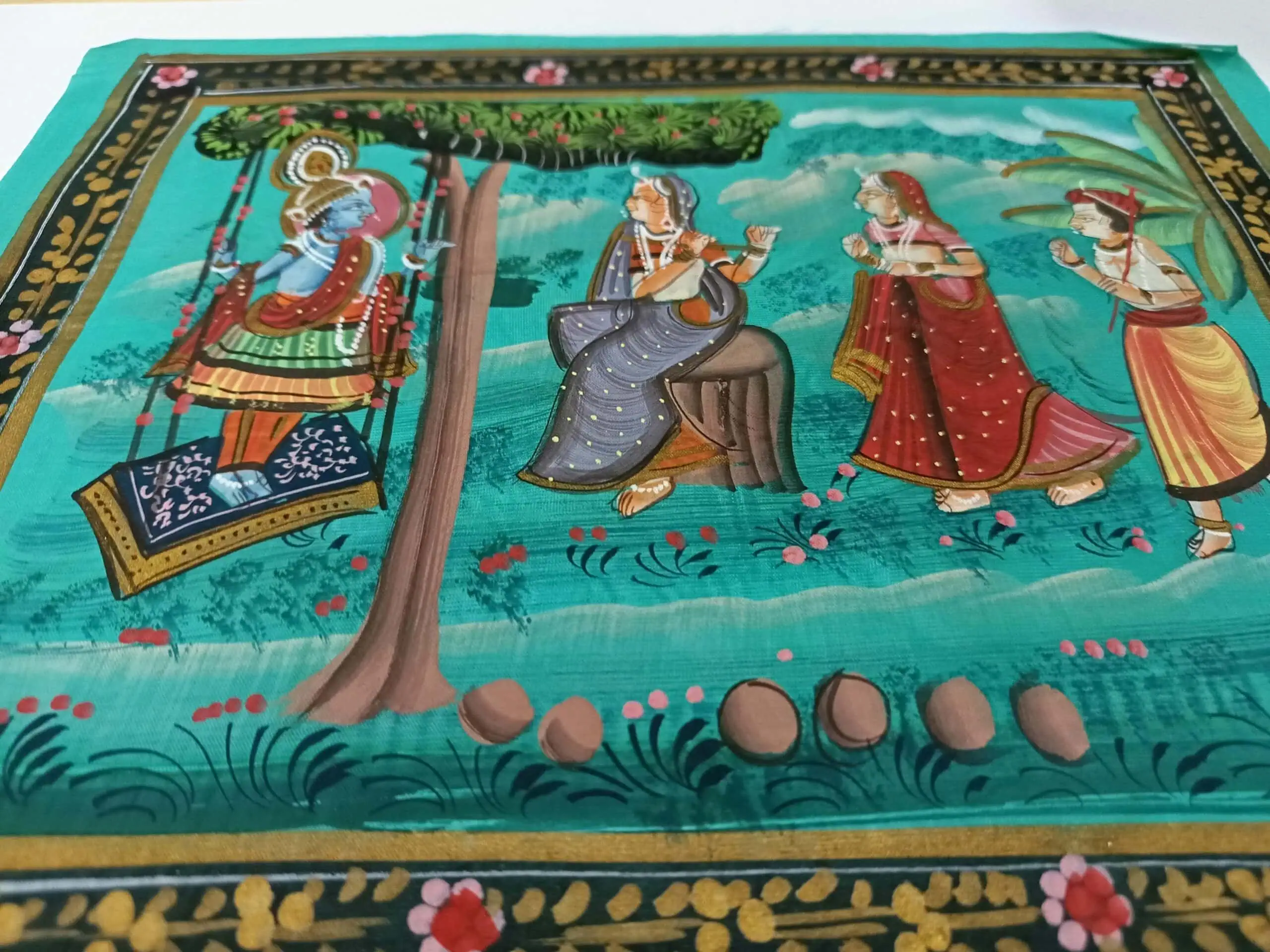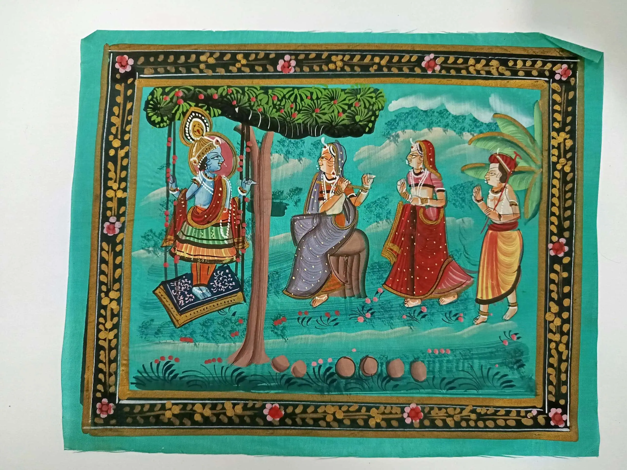 This beautiful Pichwai painting depicts Lord Krishna standing gracefully on a traditional swing, surrounded by Radha and the gopis in a scene full of devotion and joy. Crafted with intricate details and vibrant colors, it showcases the exquisite artistry and rich storytelling of Nathdwara’s Pichwai tradition. Perfect for adding a touch of divine elegance and cultural heritage to your home or sacred space.